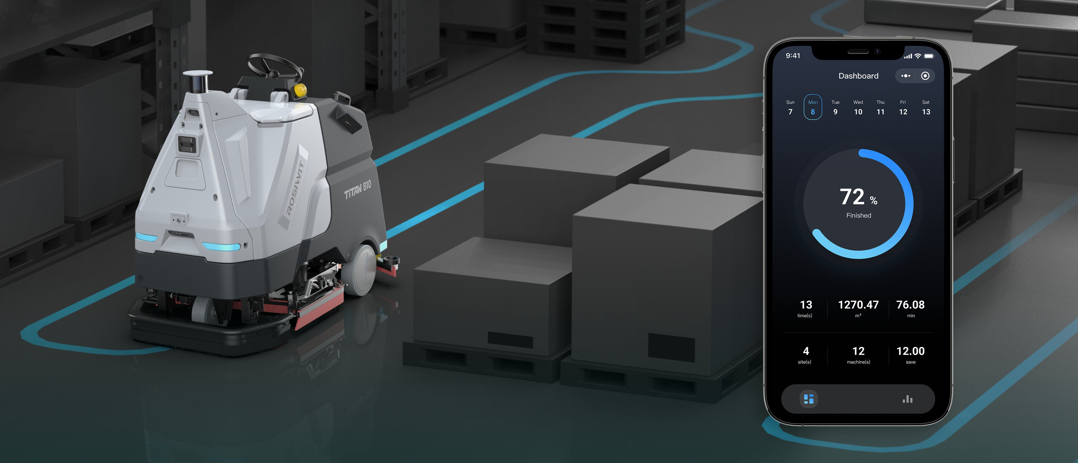 De Rosiwit Titan 810 werkt volledig autonoom dankzij het optionele 6-in-1 werkstation. Hier laadt de robot zichzelf op, vult hij automatisch water bij, leegt het vuilwaterreservoir en doseert reinigingsmiddel. Dit alles zonder tussenkomst van medewerkers. Zo bespaar je tijd én personeel. Via de intuïtieve Rosiwit-app heb je altijd en overal inzicht in de prestaties. Plan schoonmaaktaken, volg live de voortgang en ontvang gedetailleerde rapportages. Zo houd je de controle, terwijl de Titan het werk doet.